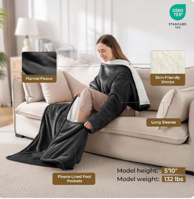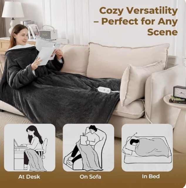 The large heated sleeves keep your arms, shoulders, and entire upper body warm while you scroll on your phone, read, work, or play. You no longer have to pull your hands out of a warm blanket and start freezing right away — Heatrobe™ keeps you warm all around while still giving your hands full freedom of movement.